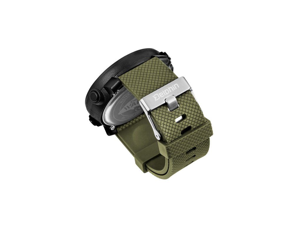 Delphin WADER sú digitálne hodinky pre každého, kto chce mať svoj čas vždy pod kontrolou. Svojím športovým dizajnom sa ideálne hodia aktívnym ľuďom, či už ide o rybárov, poľovníkov, turistov či športovcov. Okrem bežnej indikácie času disponujú niekoľkými skvelými funkciami ako budík, stopky, voliteľný 12 a 24H formát či duálny čas. Taktiež je možné pomocou tlačítka Light podsvietenie LCD displeja, vďaka čomu nestratíte pojem o čase ani počas nočných rybačiek, či iných aktivít. Gumené remienka sú na dotyk veľmi prijemne a taktiež sú dĺžkovo nastaviteľné v širokej škále. To zaručuje že sadnú na zápästie akejkoľvek hrúbky. Remienka sú navrhnuté v tmavo zelenej farbe čím ideálne zapadnú do prírodného prostredia bez toho, aby boli rušivým elementom. Samotné hodinky sú vyrobené z veľmi pevného čierneho materiálu, ktorý sa vyznačuje excelentnou odolnosťou voči mechanickému poškodeniu. Podľa medzinárodnej stupnice je tento model označený ako vodeodolný do 50m. Toto označenie spĺňa všetky náležitosti hodiniek, ktoré môžu byť vystavené tečúcej vode (napríklad sprchovanie), či pózovanie s úlovkom vo vode, kedy absolútne neprekáža ich ponáranie pod vodnú hladinu aj na dlhší čas. Delphin WADER sú jednoducho ideálny štýlový doplnok s nadupanými funkciami, vďaka ktorému budete mať vždy dokonalý prehlaď o čase. Technické parametre: Priemer ciferníka: 45mm Batéria: CR2032Dodatočné parametre