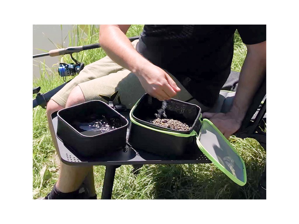 Delphin BaitBAX je praktický set z EVA materiálu, pozostávajúci z kompaktnej tašky, v ktorej sa nachádza vyberateľná miska. Je určená pre skladovanie rôznych feedrových nástrah, atraktorov, taktiež pre miešanie malých množstiev krmiva, method feedrových peletiek, alebo pre dolievanie vody. Vďaka použitému EVA materiálu je set vodeodolný, ľahko umývateľný, odolný voči poškodeniu a neabsorbuje nechcené pachy. EVA set BaitBAX je čiernej farby v kombinácií s výraznou zelenou grafikou, čím excelentne ladí s inými produktami feedrovej série REAXE. Taštička je opatrená kvalitným zipsom, určeným na kompletné uzatvorenie. Jednotlivé komponenty setu do seba skvele zapadajú, takže po ukončení vychádzky ich viete do seba poľahky vložiť, čím ušetríte miesto vo svojej výbave. Technické parametre: Rozmer tašky: 20x20x10cm Rozmer misky: 18x18x7.5cmDodatočné parametre