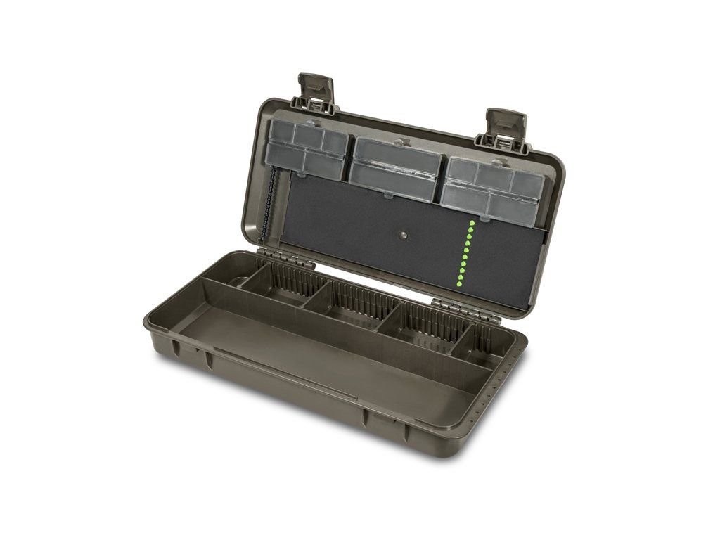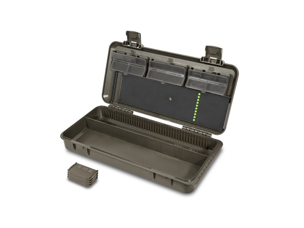 Organizér zo série KlikBOX, navrhnutý s dôrazom na praktickosť a maximálne využitie priestoru. Jeho rozloženie a úložná kapacita umožňujú pohodlne uložiť všetky nevyhnutné komponenty na výrobu koncových montáží. Vďaka kompaktným rozmerom sa bez problémov zmestí do väčšiny ruksakov a CarryAll tašiek. Spodná časť organizéra je rozdelená na dve sekcie. Prvá poskytuje najväčší úložný priestor, ideálny na uloženie napríklad uťahovača uzlov, ihiel, nožničiek či iného príslušenstva. Bez problémov sa do nej zmestí aj organizér na nadväzce KlikBOX Rig, ktorý nie je súčasťou balenia, no je možné si ho samostatne dokúpiť. Druhá sekcia je navyše rozdelená polohovateľnými prepážkami, vďaka ktorým si môžete priestor prispôsobiť presne podľa vašich potrieb. Vrchná časť organizéra slúži na uschovanie drobnej bižutérie potrebnej na zostavenie koncových montáží. O prehľadnosť a organizáciu sa starajú uzatvárateľné priehradky rôznych rozmerov. Vďaka priehľadnému prevedeniu krytov jednotlivých priehradiek budete mať vždy prehľad o tom čo sa vo vnútri nachádza. KlikBox Long je navyše vybavený platom z tvrdenej peny a špendlíkmi na pohodlné uchytenie koncových montáží. Pozdĺž celého odkladacieho priestoru na nadväzce nájdete mierku, podľa ktorej si budete vedieť presne určiť dĺžku vašich koncových montáží. Organizér je vyrobený z veľmi odolného plastu a k jeho komfortnému otváraniu a uzatváraniu poslúžia dva pevné plastové klipy. V balení sa nachádza 10 špendlíkov. Technické parametre: Vonkajšie rozmery: 35 x 16 x 6cmDodatočné parametre