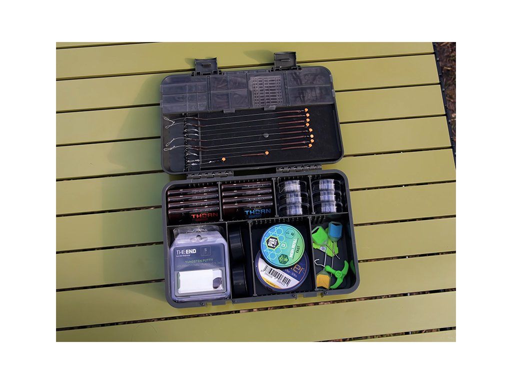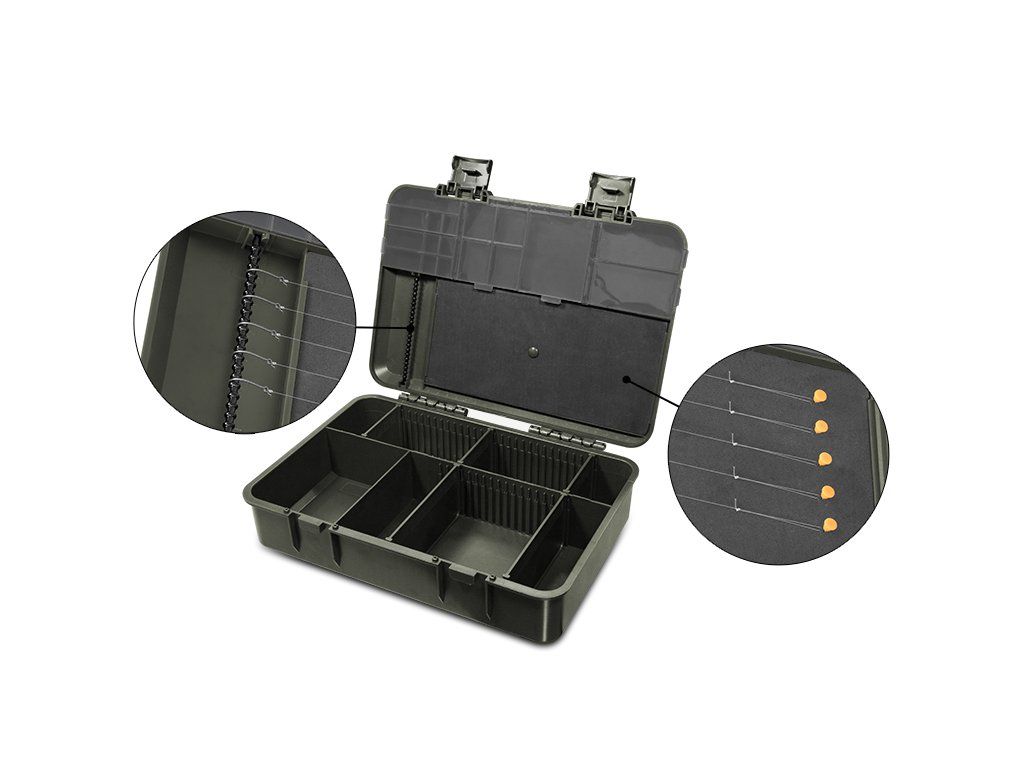 Dômyselne navrhnutý plastový organizér, ktorý vám umožní uloženie veľkého množstva bižutérie, koncových montáži, nadväzcových materiálov a iného príslušenstva, ktoré je neoddeliteľnou súčasťou vašej výbavy. V spodnej časti boxu sa nachádzajú priehradky, disponujúce vyberateľnými prepážkami, čím je možné tento priestor prispôsobiť vašim požiadavkám. Na vrchnej strane je niekoľko priehľadných, uzatvárateľných priehradok rôznych rozmerov, ktoré poskytujú ideálny priestor pre uloženie drobnej bižutérie. Vďaka ich priehľadnému prevedeniu, budete mať vždy prehľad o tom čo sa vo vnútri nachádza a potrebný komponent tak nájdete behom mihnutia oka. Okrem toho sa na vrchnej strane nachádza aj plato z tvrdenej peny a špendlíky, čo umožňuje uchytenie koncových montáži. KlikBOX Mega vám tak umožní zbaliť všetko potrebné k lovu, aby ste boli vždy dokonale pripravení. K uzatvoreniu oragnizéra poslúžia masívne klipy, ktoré sa postarajú o to, aby všetko ostalo na svojom mieste. Devízou tohto boxu sú aj kompaktné vonkajšie rozmery, vďaka čomu nebude problém prenášať ho v CarryAll taške alebo ruksaku. Do organizéra KlikBOX Mega ideálne pasujú najmenšie krabičky zo série KlikBOX a to konkrétne KlikBOX Mini 8, ktoré je možné samostatne zakúpiť. Technické parametre: Vonkajší rozmer krabice: 28,5x21x7cm Rozmer peny na nadväzce: 22x10cmDodatočné parametre