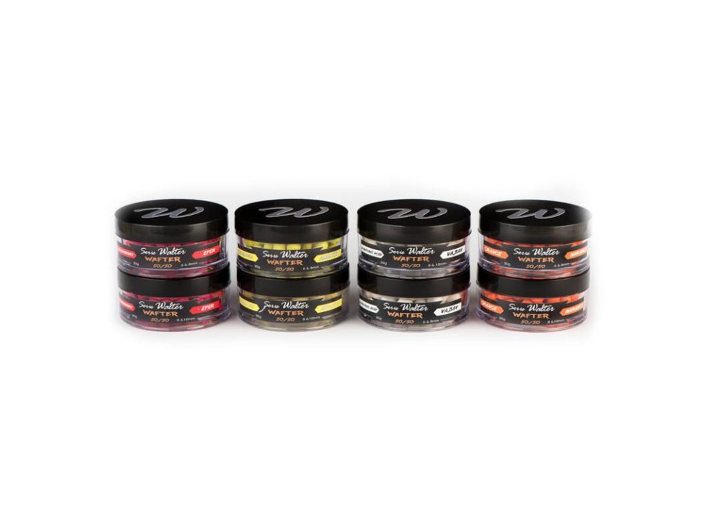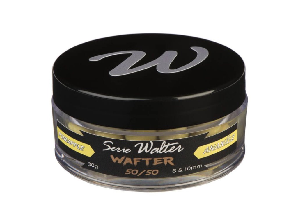SÉRIA WALTER WAFTER Najmodernejšie ľahké kaprové nástrahy, ľahšie ako voda, ale pri nastražení na háčik nezdvíhajú najmenší háčik a "plávajú" na dne. Sú k dispozícii v príchutiach kukurica, panettone, biela čokoláda, jahoda, ananás, kyselina maslová a pomaranč v exkluzívnych delených nádobkách v kombináciách veľkostí 6-8 mm a 8-10 mm.